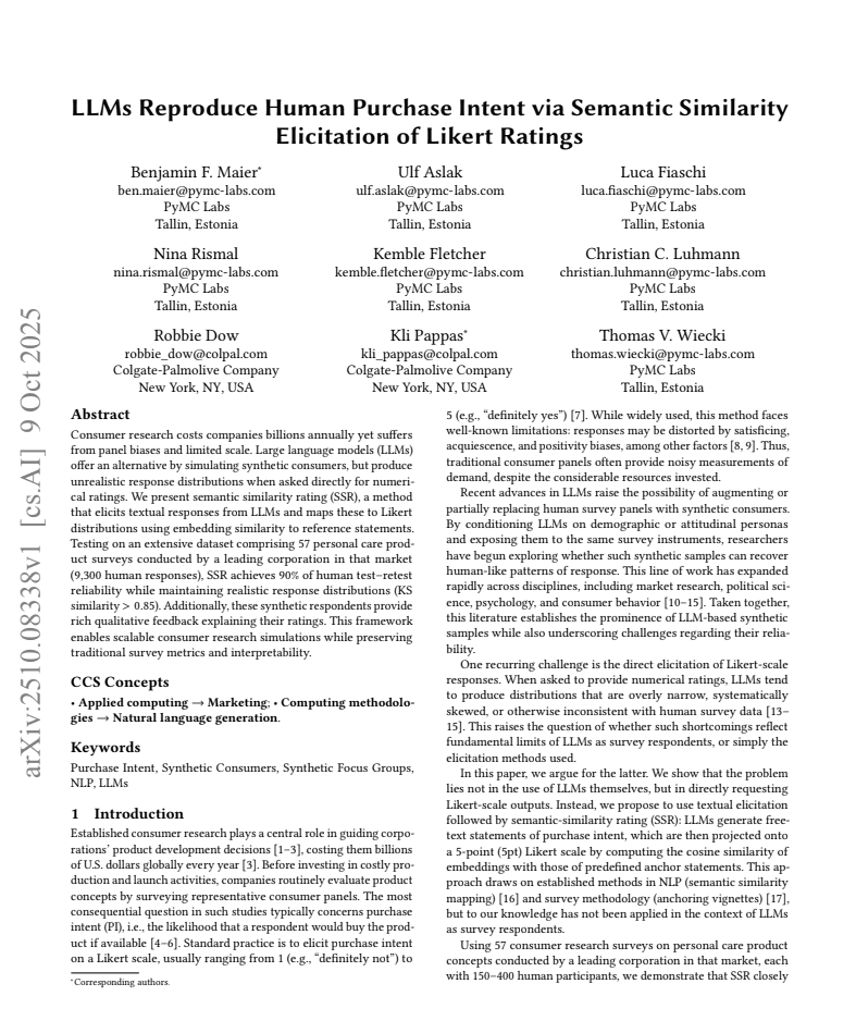 얼리버즈는 PyMC Labs, Colgate-Palmolive Company 에서 수행하여, 90% 수준의 '검사-재검사 신뢰도(test-retest reliability)'를 달성한 '의미론적 유사도 평가'(Semantic Similarity Rating, SSR)를 적용하였습니다.
